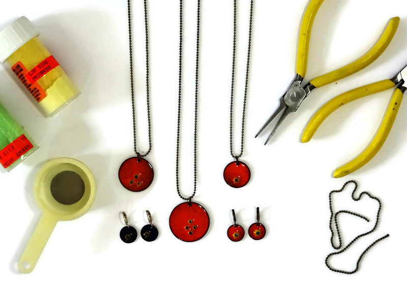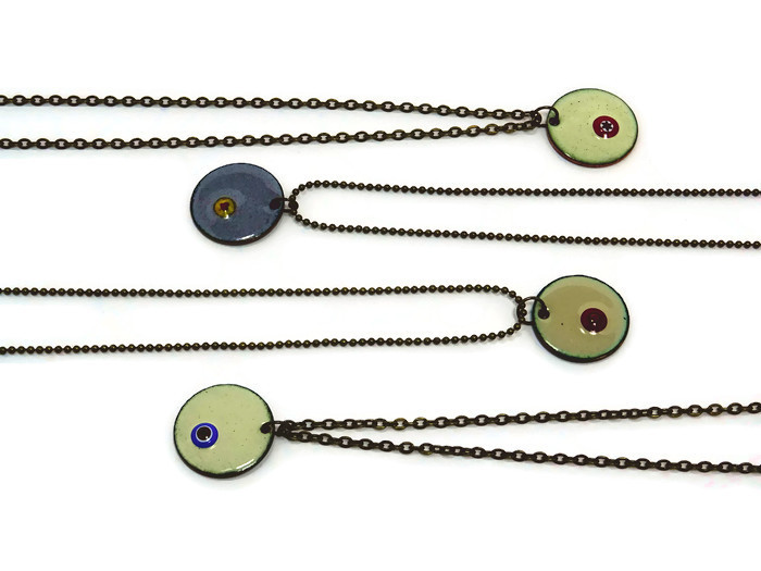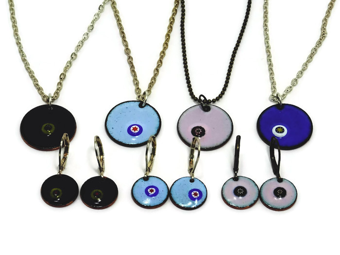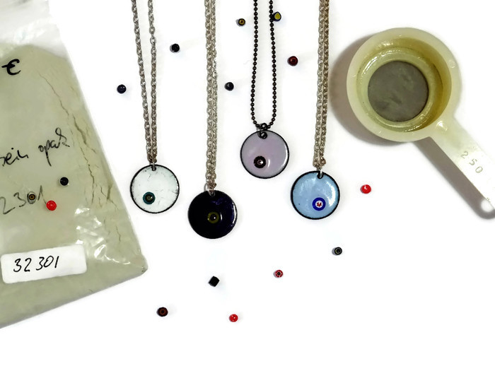 Bunte Emaille Ketten mit winzigen Millefiori Motiven. Die Ketten habe ich in verschiedenen Farben vorrätig. Zudem gibt es die Kettenanhänger in 3 verschiedenen Größen. Als Ergänzung gibt es farbliche passende Ohrringe zu den Emaille Ketten.