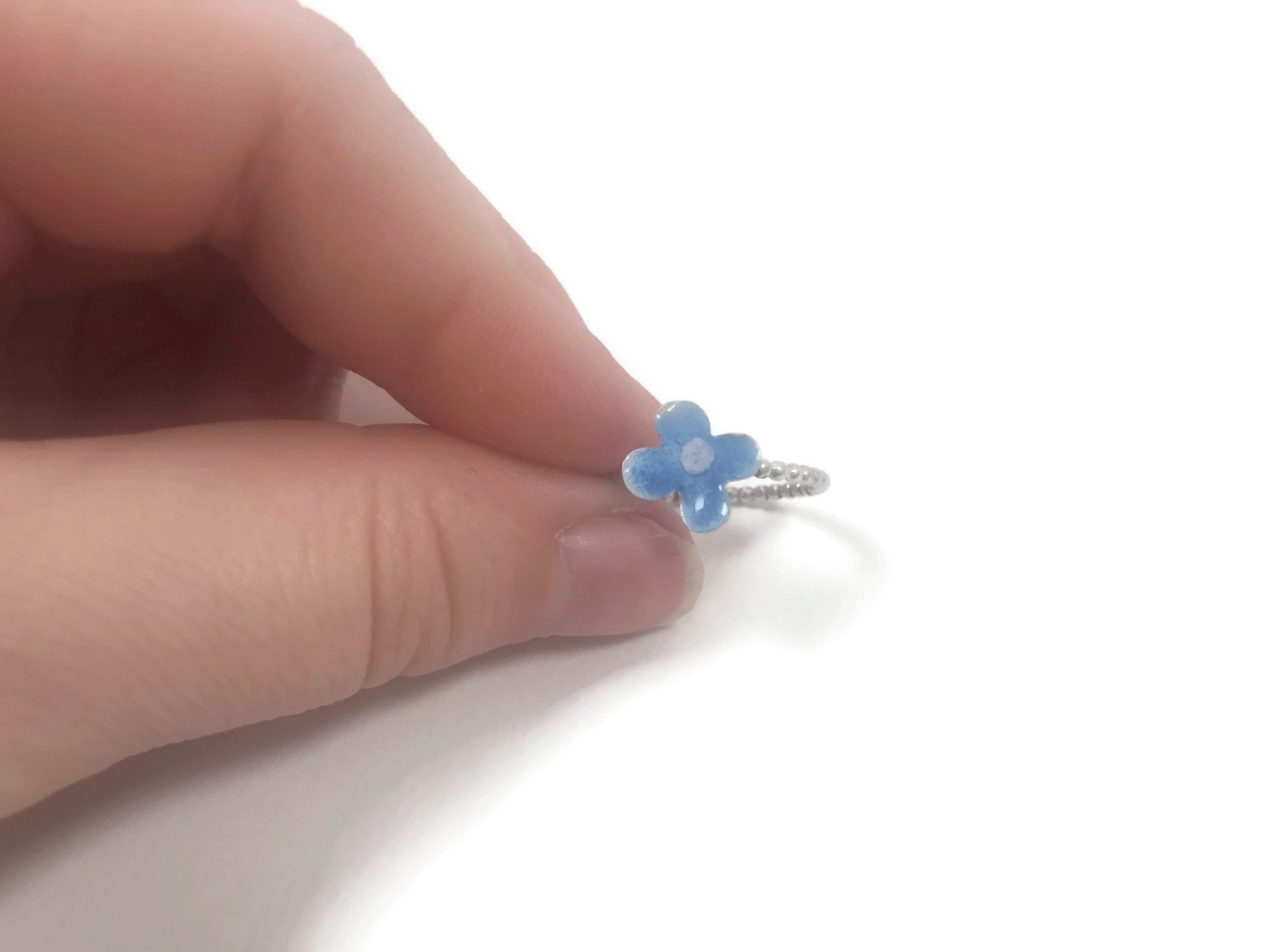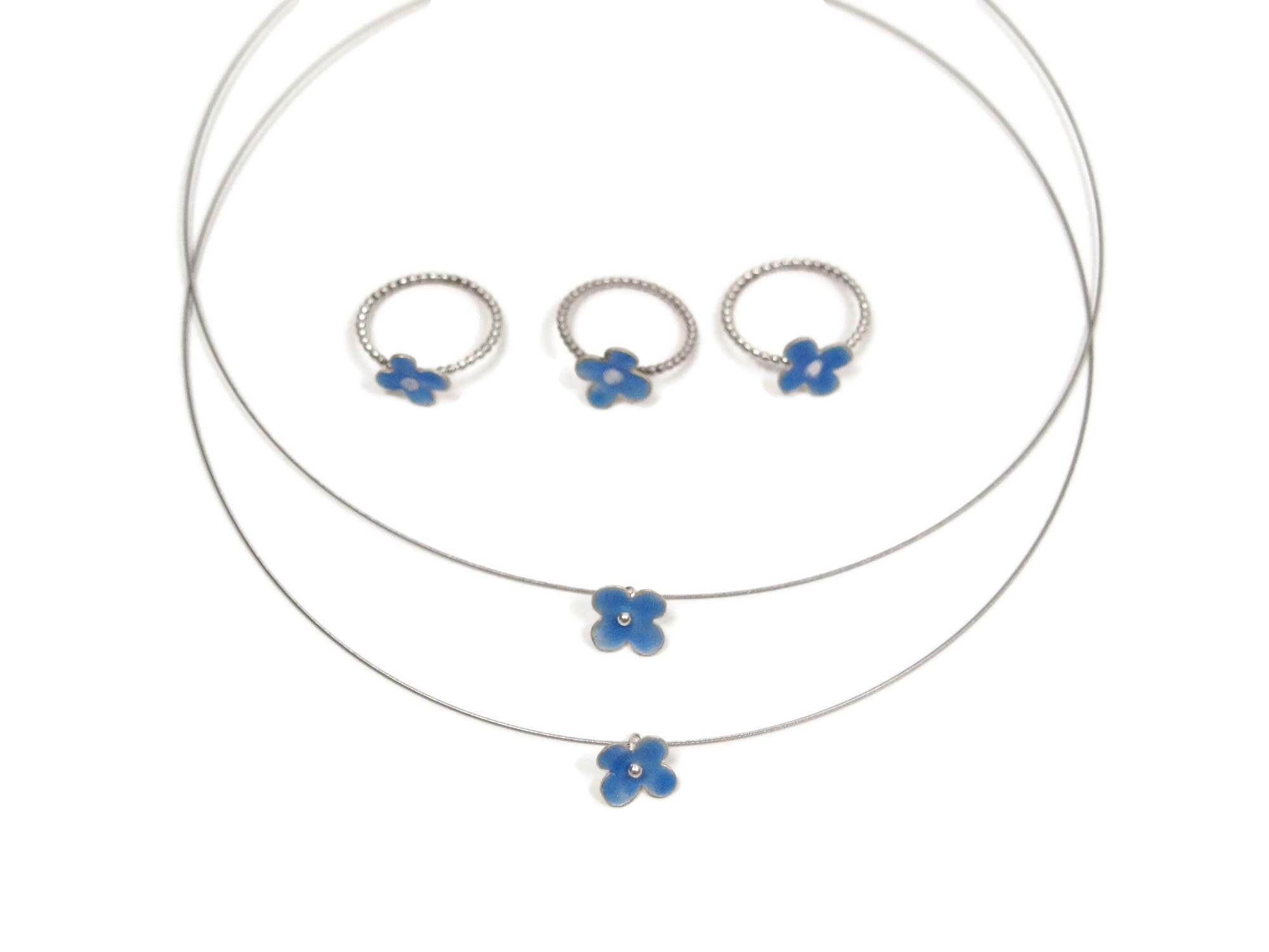 Diese frühlingshafte und sommerliche Kollektion beinhaltet Silberschmuckstücke mit emaillierten Blumen. Du kannst dich mit filigranen Ringen, zarten Halsreifen, verspielten Ketten und Ohrringen schmücken. Momentan biete ich die Schmucklinie in zwei Farbvarianten an: hellblau und ein zartes lila.